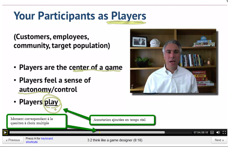 Pendant les videos, une question à choix multiple apparait, et nécessite une bonne réponse pour pouvoir continuer la lecture.
