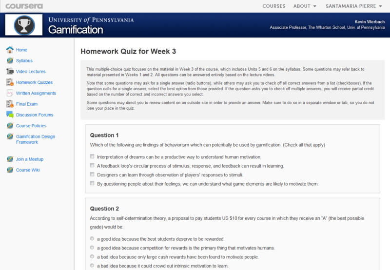 C’était avant l’arrivée de Coursera. Je n’ai pas coutume de m’enthousiasmer pour des services web, mais là…chapeau. J’ai découvert cette plate-forme par hasard, car elle proposait un cours sur la gamification, sujet que j’affectionne tout particulièrement (voir mes billets précédents), et que j’ai donc suivi pendant 6 semaines.